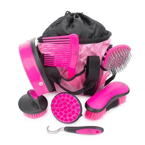 A practical & stylish horse grooming kit with over shoulder strap, with external pockets and a set of 7 matching grooming accessories including horse brushes to keep you well organised when preparing your horse for your next horse show or event.