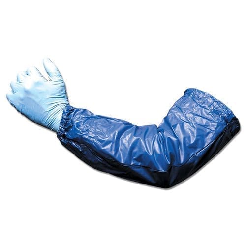 • Economical 8 mil clear blue vinyl sleeves are 45 cm long with elastic gathers at wrist and top.